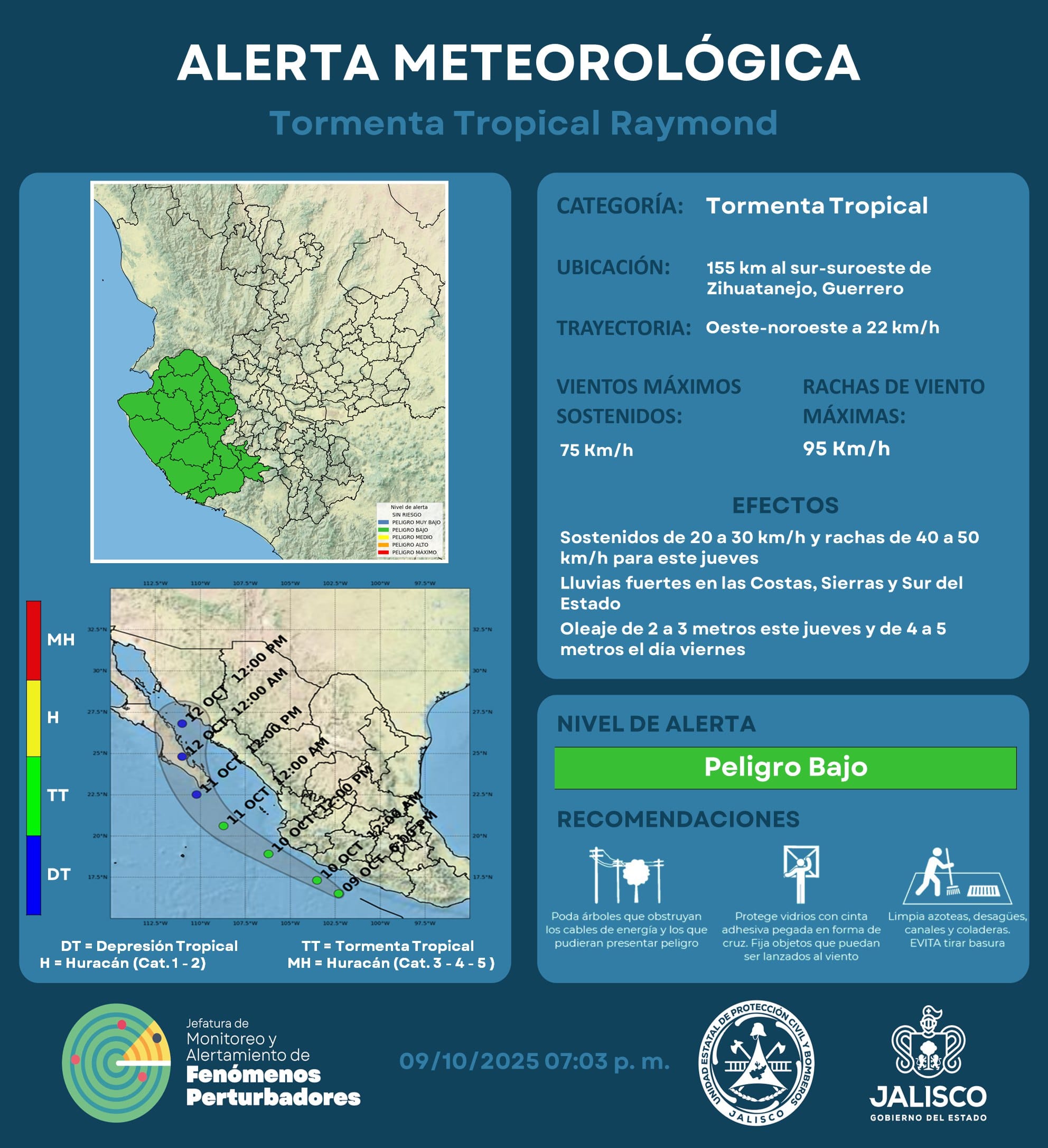 La Tormenta Tropical Raymond se encuentra a 155 kilómetros al sur-suroeste de Zihuatanejo, Guerrero, desplazándose hacia el oeste-noroeste a una velocidad de 22 km/h, con vientos sostenidos de 75 km/h y rachas de hasta 95 km/h.