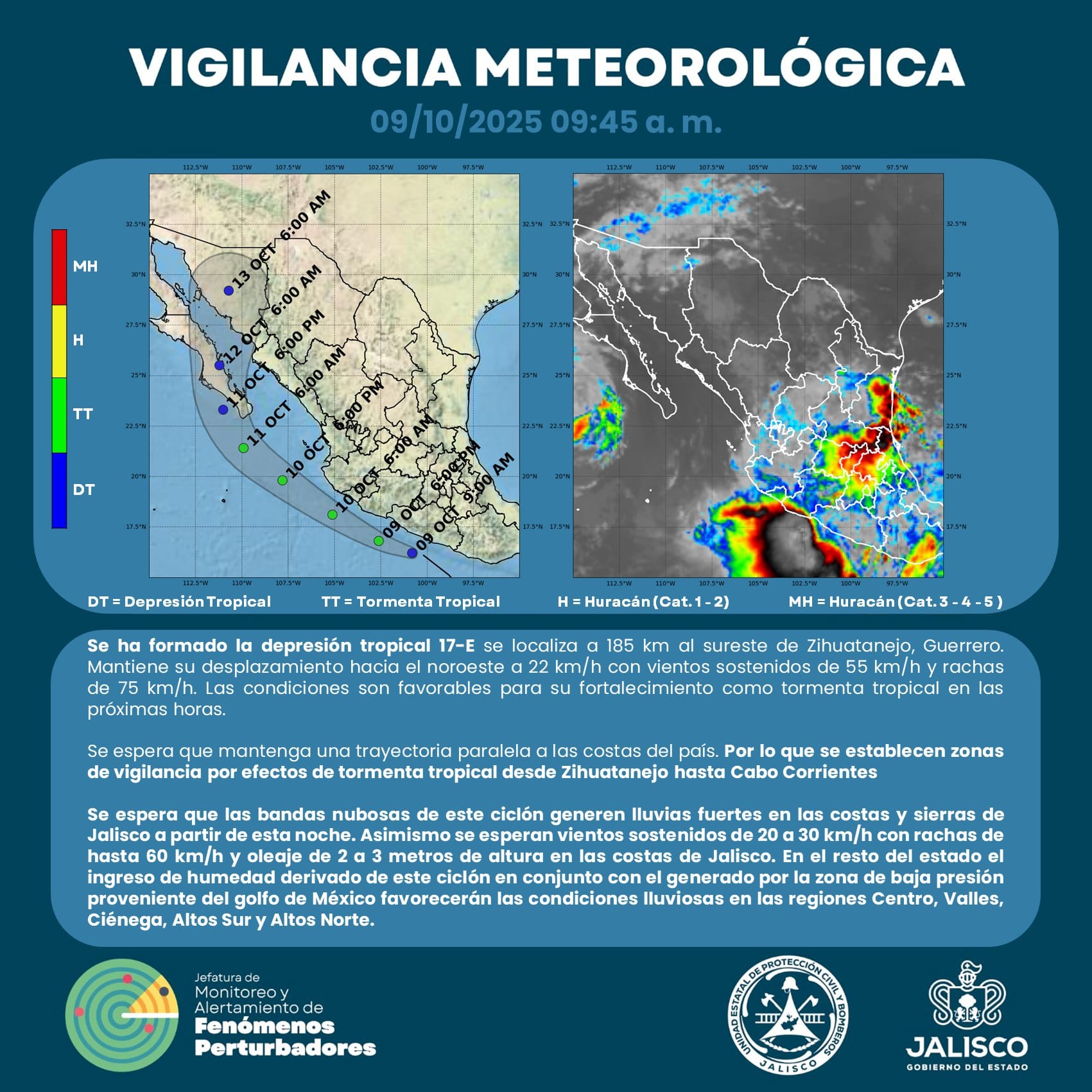 La Jefatura de Monitoreo y Alertamiento de Fenómenos Perturbadores informa que se ha formado la Depresión Tropical 17-E, ubicada a 185 km al sureste de Zihuatanejo, Guerrero, con desplazamiento al noroeste a 22 km/h. Registra vientos sostenidos de 55 km/h y rachas de 75 km/h, con condiciones propicias para intensificarse a tormenta tropical.