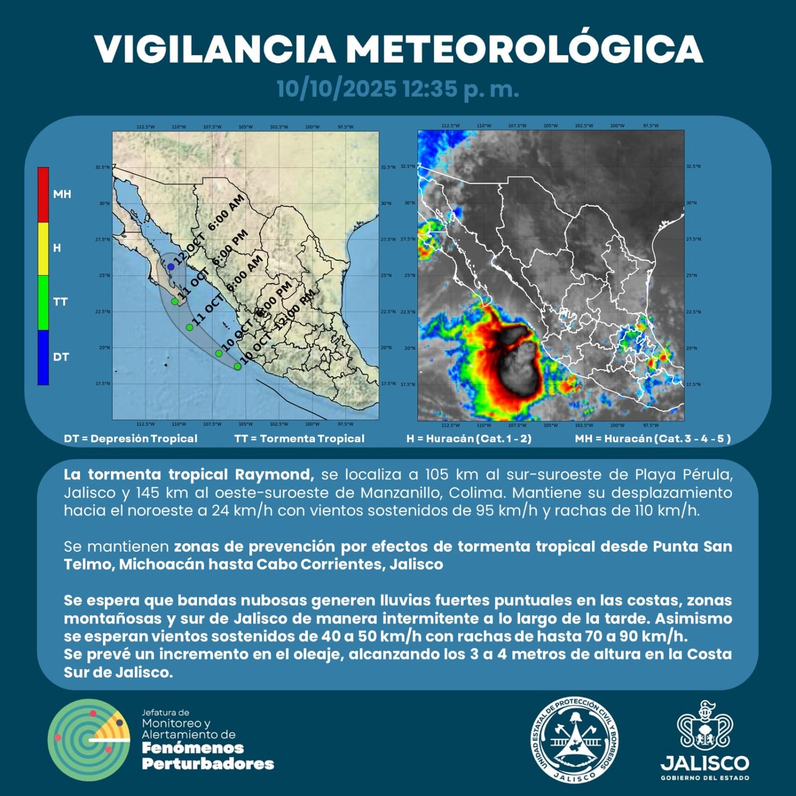 Las autoridades mantienen vigilancia permanente ante la presencia de la tormenta tropical “Raymond”, que se localiza al sur de las costas de Jalisco y Colima, desplazándose hacia el noroeste con vientos sostenidos de 95 km/h y rachas de hasta 110 km/h.