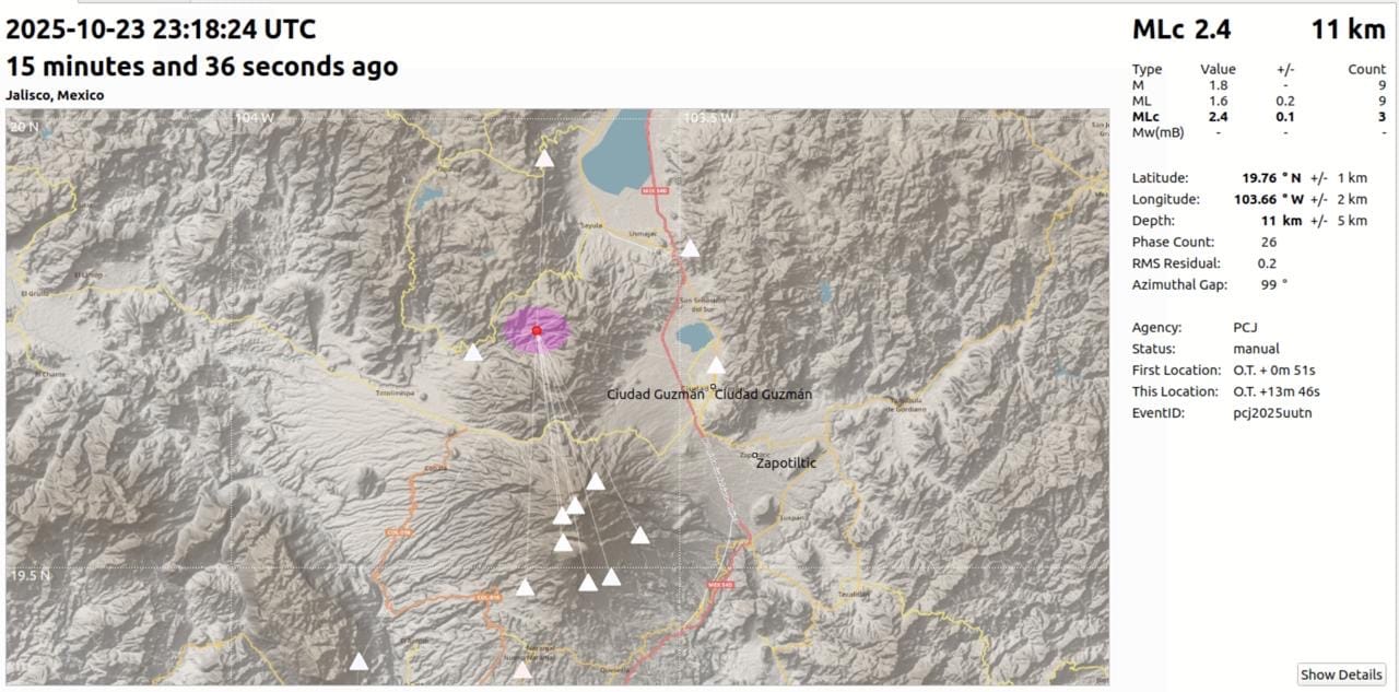Se registró un sismo con magnitud 2.4 (preliminar), localizado 11.1 km al noreste de San Gabriel, Jalisco, a una profundidad de 11 km.