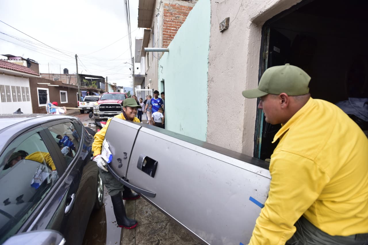 En Zapopan, específicamente en la colonia La Martinica, trabajan 305 oficiales y 86 vehículos en el retiro de árboles y lodo en vialidades, además de la limpieza de casas afectadas. De manera preliminar, se reportan 42 viviendas con daños en menaje en las colonias La Martinica y Balcones de la Cantera, así como 15 vehículos afectados.