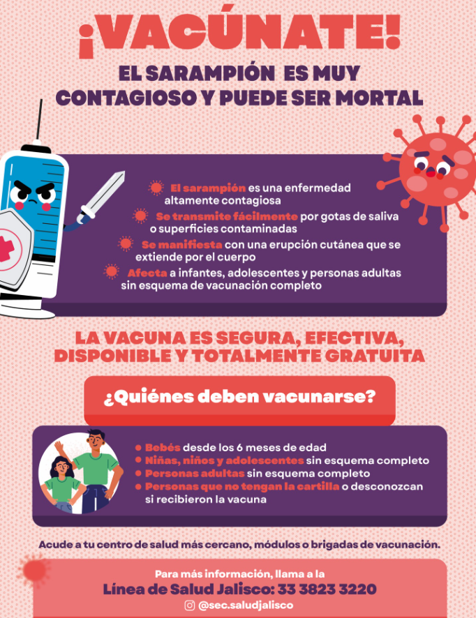 Ante el brote nacional de sarampión, el Gobierno de Jalisco, a través de la Secretaría de Salud Jalisco y la Secretaría de Educación Jalisco, reforzó acciones preventivas en más de 2 mil planteles escolares del estado, con énfasis en vacunación, limpieza, ventilación y uso de cubrebocas.