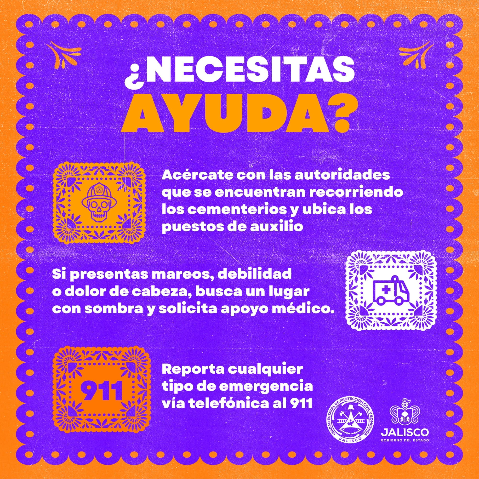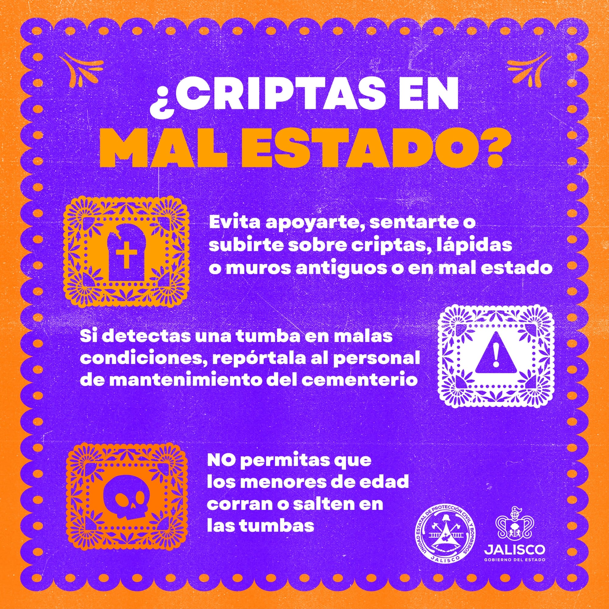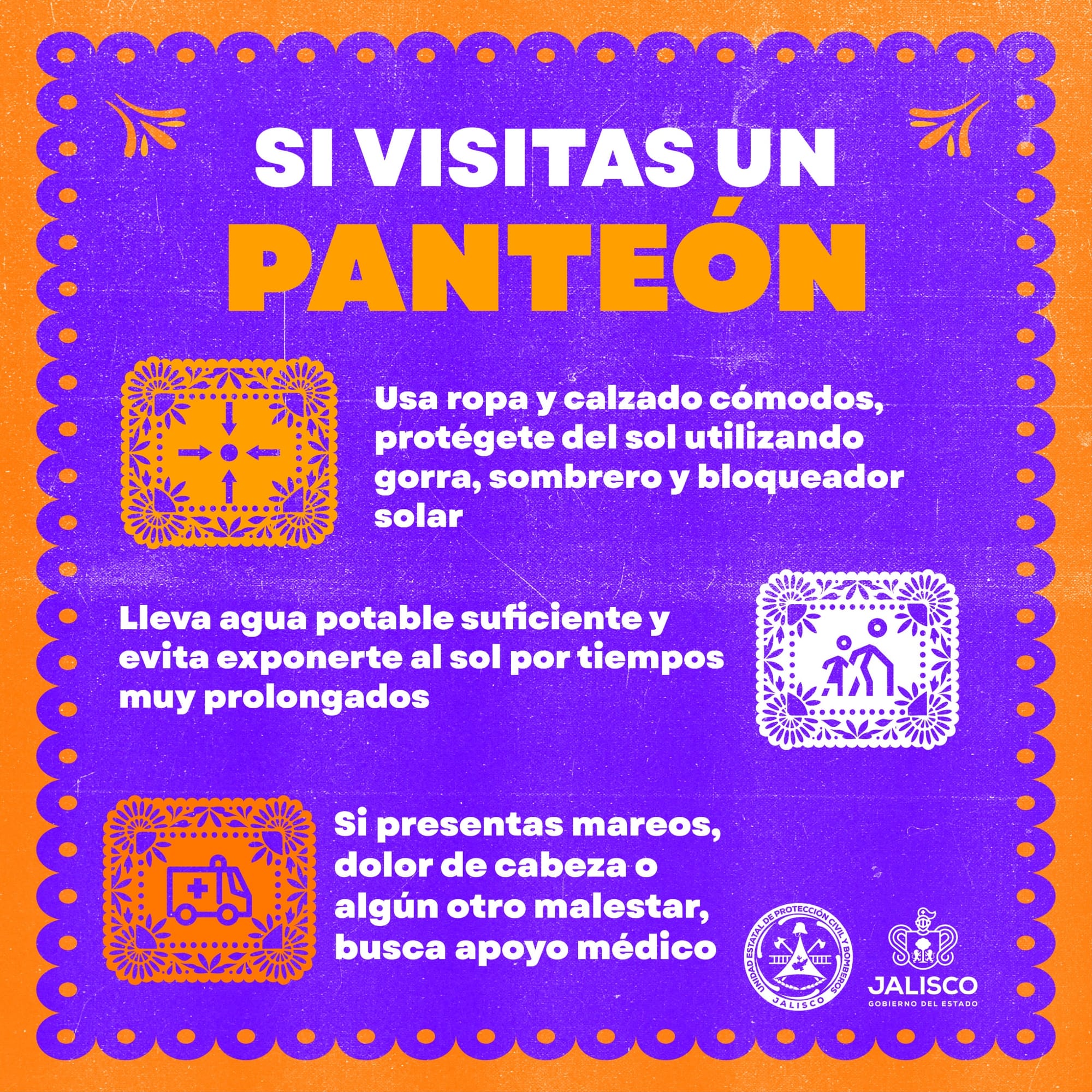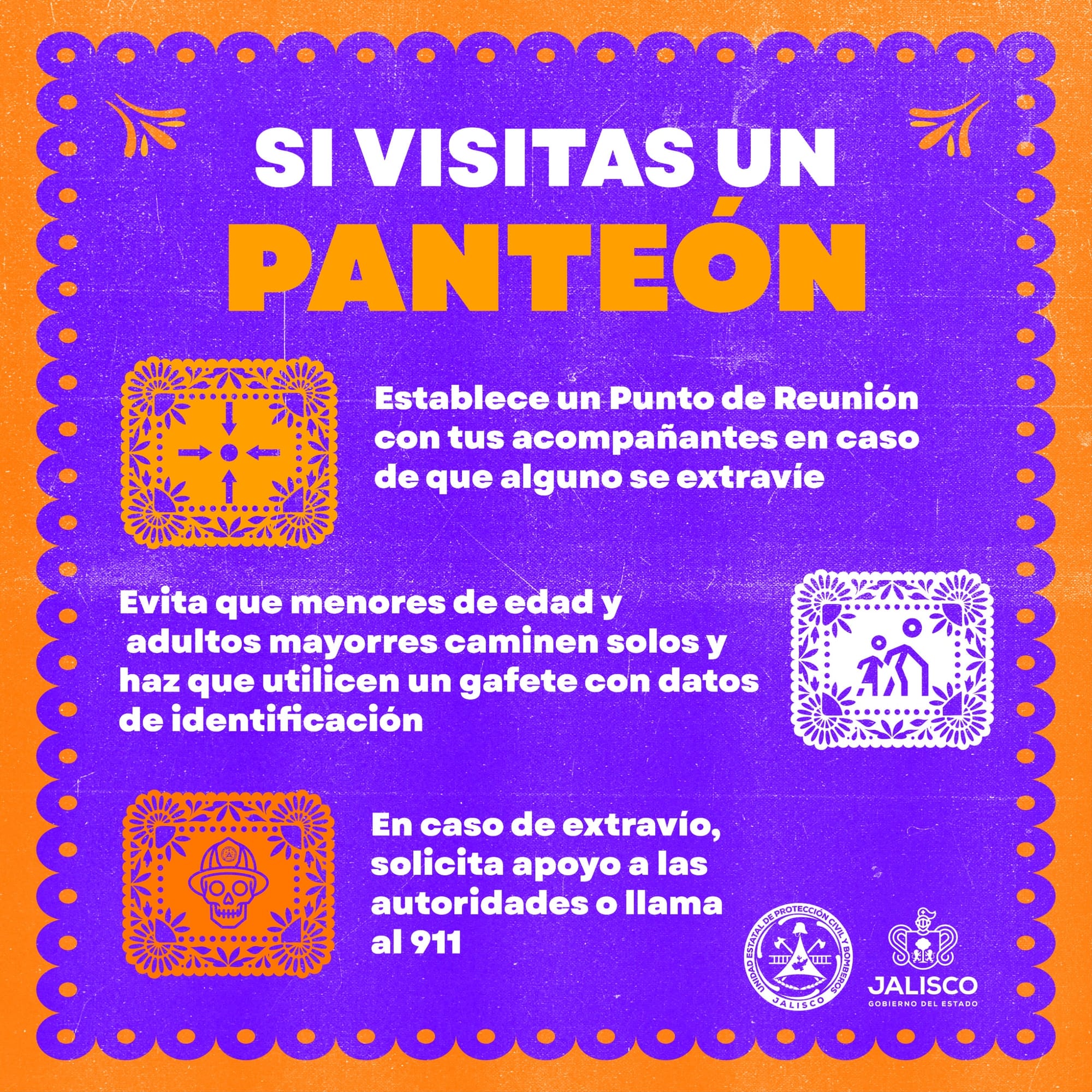 Ante la gran afluencia esperada durante los días 1 y 2 de noviembre, la Unidad Estatal de Protección Civil y Bomberos Jalisco, en coordinación con las unidades municipales de Protección Civil, así como con Seguridad Pública y Servicios Médicos, hace un llamado a la población para mantener una actitud de respeto, orden y prevención, con el objetivo de evitar incidentes y preservar la seguridad de todas y todos los visitantes.